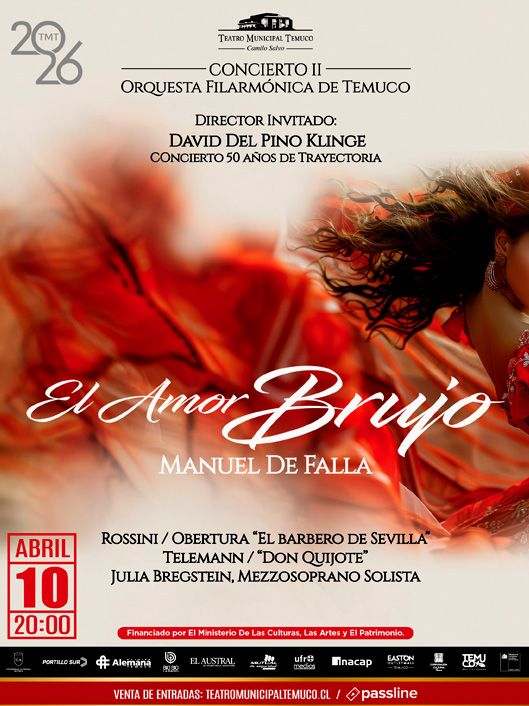 La velada será dirigida por el maestro David del Pino Klinge, quien en 2026 celebra 50 años de trayectoria artística y se encuentra realizando una serie de conciertos en el país, iniciando este ciclo en Temuco junto a la Orquesta Filarmónica. El concierto contará además con la participación de la mezzosoprano Julia Bergstein, solista invitada que dará voz a la intensidad y el misterio de El amor brujo, una obra donde el canto se funde con el pulso dramático y la fuerza rítmica de la orquesta.