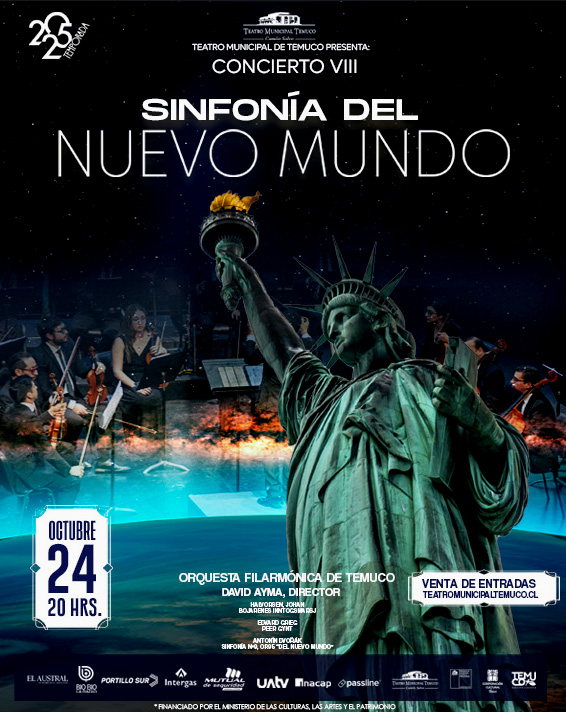 El Concierto VIII de Temporada de la Orquesta Filarmónica de Temuco, dirigida por David Ayma, lleva por nombre “Sinfonía del Nuevo Mundo” y tendrá como eje la Sinfonía n.º 9, Op. 95 “Del Nuevo Mundo” de Antonín Dvořák, escrita en 1893 en Nueva York, donde el compositor mezcla su raíz bohemia con ideas inspiradas en América: un segundo movimiento de melodía amplia y contemplativa, un tercero de pulso danzante y un final enérgico que reúne los temas en un gran cierre. La velada abrirá con “Bojarenes inntogsmarsj (Marcha de entrada de los boyardos)” de Johan Halvorsen, breve y brillante, de aire ceremonial y protagonismo de bronces y percusión. Continuará con una selección de las suites Peer Gynt Op. 46 y Op. 55 de Edvard Grieg, música incidental para el drama de Ibsen que recorre paisajes nórdicos y momentos muy reconocibles —como el amanecer lírico o la tensión creciente de la gruta—, combinando melodías memorables y color orquestal.