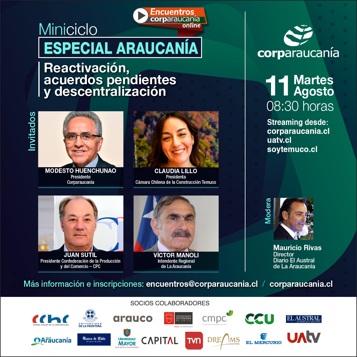 Con la visión de priorizar la situación de La Araucanía como un tema país e impulsar avances en ejes estratégicos de desarrollo, Corparaucanía realizará el miniciclo “Especial Araucanía”, cuya primera sesión “Reactivación, acuerdos pendientes y descentralización”, será este martes 11 de agosto, a las 08:30 horas, desde corparaucania.cl y plataformas asociadas.