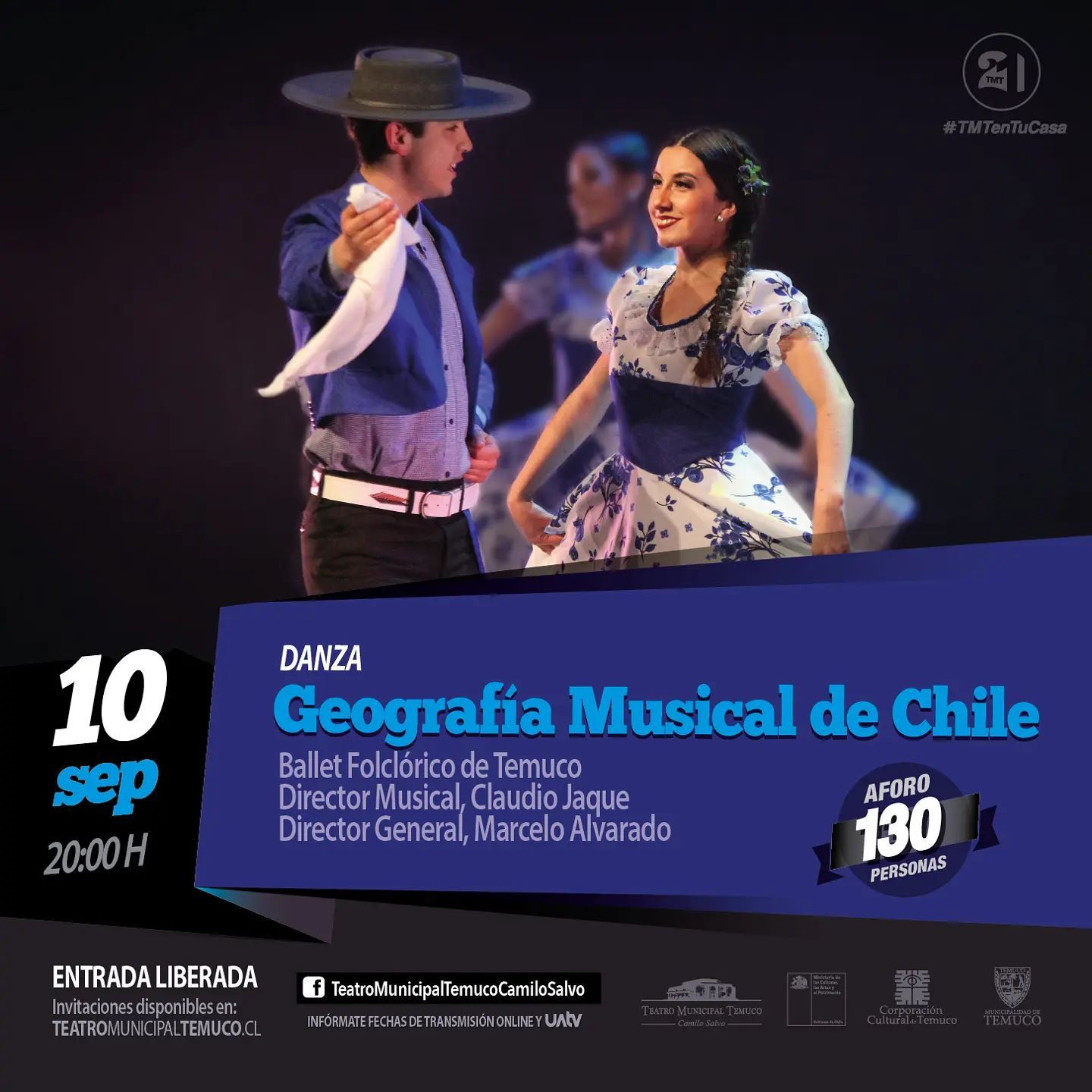 Geografía Musical de Chile Por Alejandra Leal - 7 septiembre, 2021 FacebookTwitterPinterestWhatsApp El Teatro Municipal de Temuco presentará «Geografía Musical de Chile», este viernes 10 de septiembre, a las 20 horas, en un espectáculo a cargo del Bafote Chile. La entrada es liberada y las invitaciones están disponibles en teatromunicipaltemuco.cl