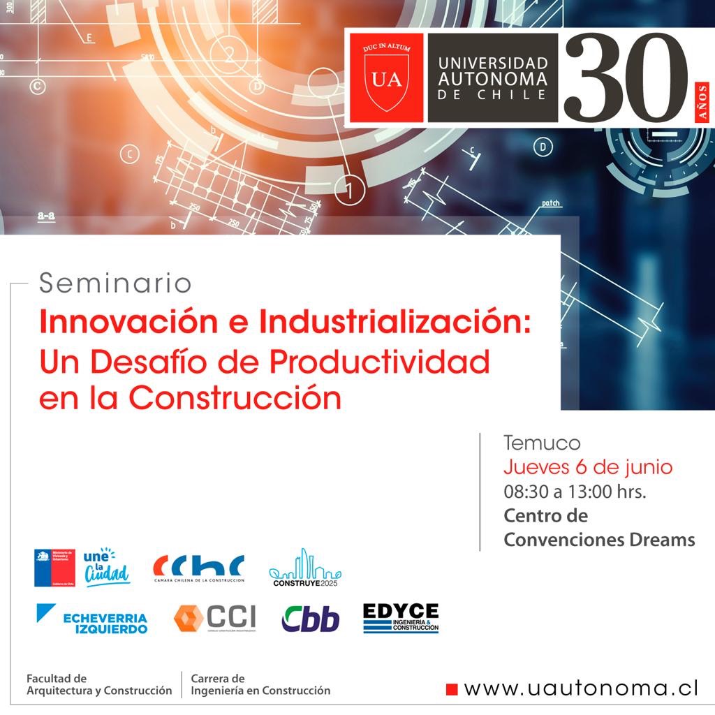Seminario, organizado por la Facultad de Ingeniería y Construcción de la Universidad Autónoma, que contará con más de 10 expositores destacados del rubro de la construcción este jueves 06 de junio, de 08:30 a 13 horas, en el Centro de Convenciones del Hotel Dreams de Temuco.