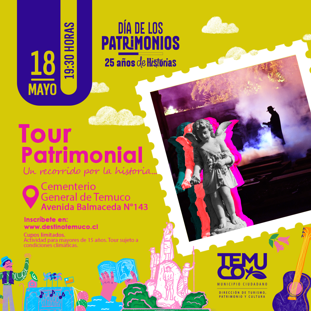 Para celebrar el Día de los Patrimonios regresan los recorridos nocturnos y teatralizados en el Cementerio General de Temuco. Se trata de tours patrimoniales que rescatan la historia de este espacio, su arquitectura, símbolos y personajes. Los tours están enfocados en el rescate de la historia del Cementerio General, recorriendo las tumbas y mausoleos de personas relevantes en la historia de Temuco, donde para la teatralización se utilizará musicalización, sonidos sensoriales, atmosferización, además de considerar algunas interpretaciones para sorprender a los asistentes. Inscríbete gratis. En caso de lluvia se reprogramará el recorrido. Cupos Limitados *La duración del recorrido es de 1 hora aprox